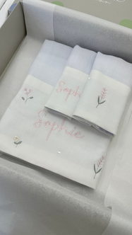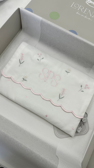 Neste projeto, trabalhamos com uma paleta clássica — azul bebê e rosa bebê — para criar um conjunto delicado e atemporal. O bordado de flores diversas trouxe um toque bucólico e refinado ao design.
