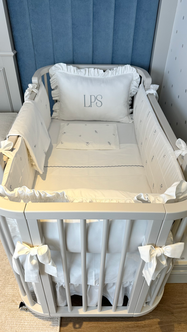 Oferecemos uma linha completa de rouparia para bebês e todo o suporte necessário para navegar pelo universo do berçário e da maternidade. Em parceria com a mãe, desenvolvemos um design exclusivo que harmoniza com o quarto do bebê e com o estilo da família— dos tecidos aos bordados.